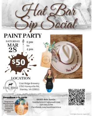 Create your own hat & purchase snacks from the Charcuterie cart at Coal Ridge Brewery. Sip Social – Craft & Snack. $50 ticketed event.